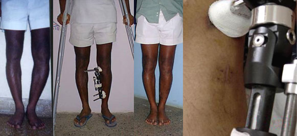 | The picture second from left shows the post surgery status about 4 weeks after surgery (High tibial Osteotomy using an Orthofix fixator). The deformity has been corrected by gradual distraction of 1mm per day. The patient is walking with the aid of a pair of axillary crutches. |