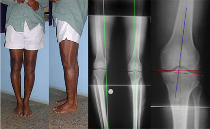 | The picture on extreme left shows that the patient had varus deformity of the proximal tibia i.e. bow legs (reduced angle at the bone close to knee) on both the sides, with the mechanical axis of the lower limbs (load bearing axis from the hip to the ankle) passing on the inner side of both the knees (normally the line should be passing from the center of the knee). |
