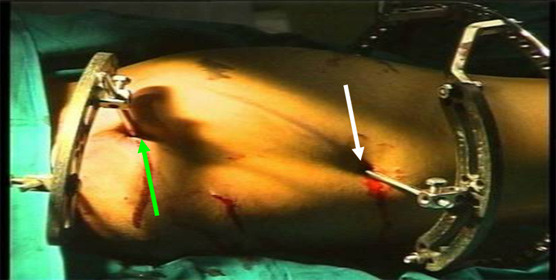- Adequate release of skin tension (green arrow) at the end of surgery to release skin tenting (white arrow), to allow easy movement of skin and soft tissue over the pins while movements, reduces pain and discharge from the pin sites.